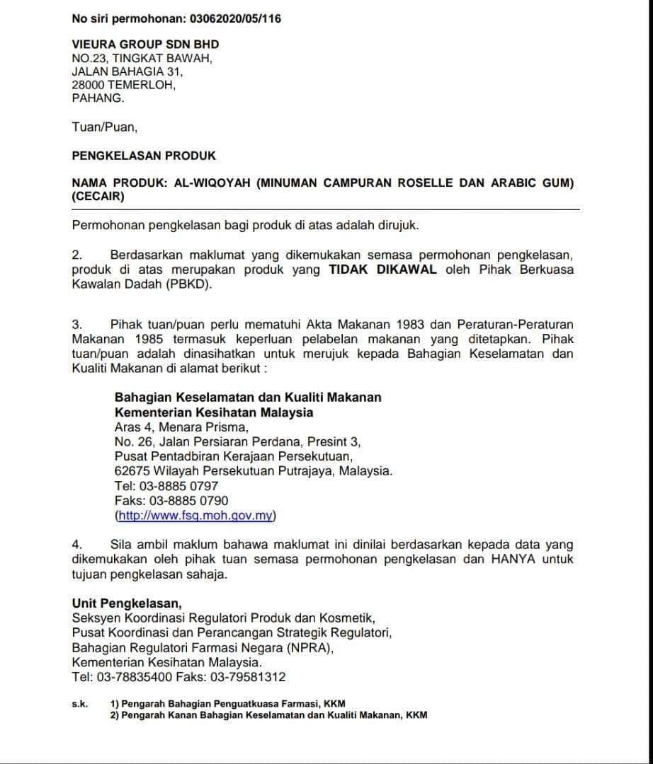 Ya ada: Jus Al-Wiqoyah dikelaskan sebagai suppliment di bawah klasifikasi makanan tambahan tanpa bahan kimia & steroid Nombor Rujukan: 03062020/05/116